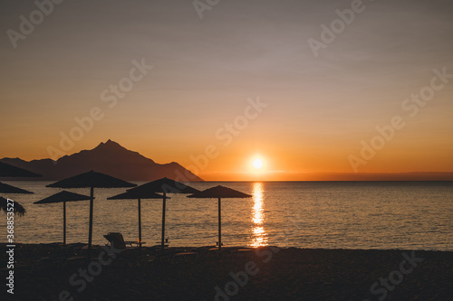 sunrise, summer, sea, sun, morning, water, sky, beach, nature, sunset, orange, emotion, landscape, evening, red, light, calm, mountain, island, cloud, coast, beautiful, summer, early, rise, shades, sunbed, sunshade, chair, no people, nobody, lonely, greece, greek, mediterranean, tropics, tropical, travel, destination, touristic, romance, peaceful, peace, background, positive, happy