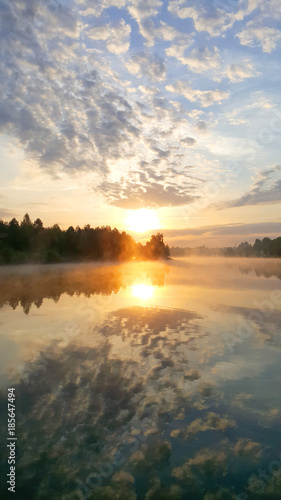 fog, sunrise, lake, water, russia, russian, sky, cloud, landscape, nature, wilderness, flora, outdoors, wild, terrain, earth, scenery, solitude, summer, environment, background, beauty, beautiful, black, white, blue, orange, ecology