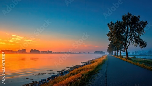sunrise, sunset, morning, evening, river, road, misty, fog, calm, landscape, nature, tranquil, scenic, colourful, vibrant, autumn, summer, tree, path, water, horizon, sky, gold, orange, blue, green, yellow, grey, light, grass, stone, countryside, rural, peaceful, beauty, dramatic, golden hour, early, late, roadside, river bank, cloud