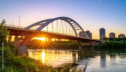 sunrise, bridge, river, arch, modern, city, sunset, landscape, architecture, metal, steel, urban, sky, light, gold, river bank, tranquil, nature, calm, view, morning, evening, photo, city landscape