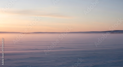 Sunrise over a snowy field with a layer of fog creating a dreamy scene