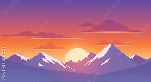 mountain, sunrise, sunset, landscape, nature, snow, colours, gradient, illustration, vector, sky, cloud, peace, calm, light, orange, purple, violet, background, design, graphic, image, digital, nature scene, mountain chain, artwork, peaceful, morning, evening, isolated