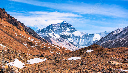 Sunrise over the snow-capped mountains from a viewing platform on the way to Mount Everest in Tibet