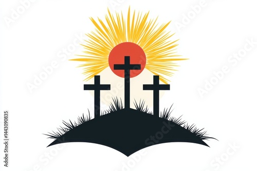 Sunrise over three crosses on a hill with rays of light illuminating the scene