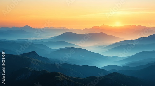 sunrise, mountain, landscape, panorama, view, horizon, layer, peak, vale, misty, fog, cloud, colours, hue, shades, blue, orange, gold, sunlight, morning, calm, serene, quiet, beauty, nature, scenery, calmness, elevation, huge, expansive, majestic, grandeur, atmospheric, perspective, distant, silhouette, ridge, mist, textured, rugged, dramatic, peaceful