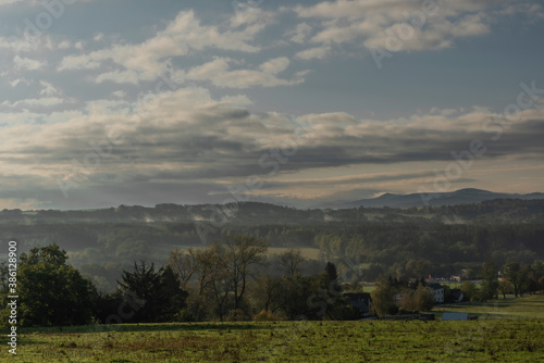 Sunrise time near Ceske Budejovice city in autumn color morning