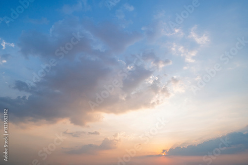 sunset / sun rise sky with rays of light shining clouds and sky background and texture.