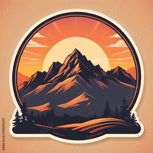Sunset above mountains peak silhouette. Vintage styled mountain logo or sticker or poster template. Vector illustration