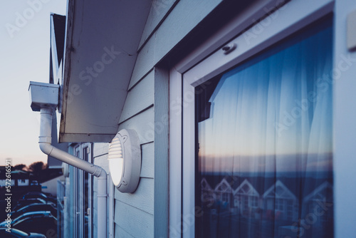 Sunset at a holiday resort showing the setting sun on patio doors. The poor light is illuminated, set by an automatic timer.