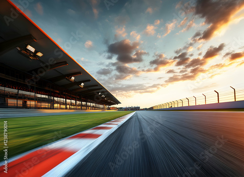race track, speed, sunset, racing, competition, asphalt, motion, blur, horizon, cloud, sky, orange, red, yellow, twilight, evening, track, curve, grandstand, fence, grass, stadium, motorsport, sport, automotive, fast, dynamic, energy, adrenalin, landscape, photo, wide, angle, photo, image, picture, view, scene, nature