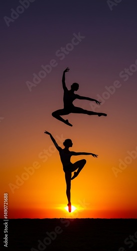 silhouette, dancer, ballet, sunset, jump, leap, grace, elegance, pose, athletic, movement, art, beautiful, vibrant, sky, orange, purple, sun, feminine, performance, dynamic, energy, freedom, calmness, balance, stillness