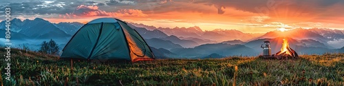 sunset, camping, campground, campfire, tent, mountain, sky, vibrant, cosy, wilderness, adventure, nature, evening, tranquil, relaxation, get-away, solitude, dusk, explore, serenity, mountain chain, scenic, warmth, flames, golden hour, scenic beauty, escape