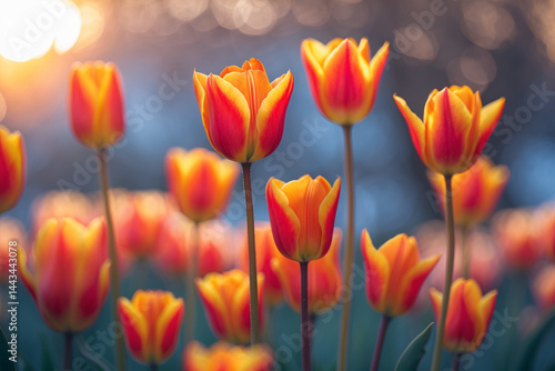 Sunset Glow Vibrant Red and Yellow Tulips in a Spring Garden