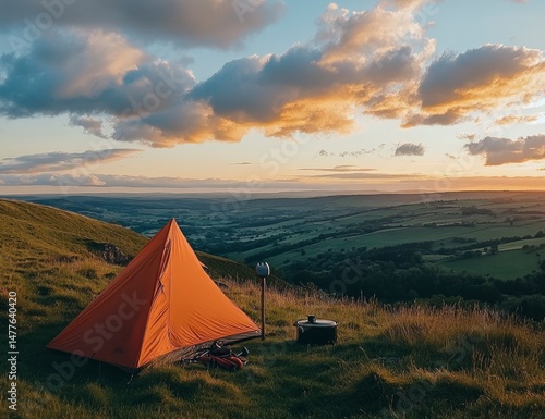 tent, camping, sunset, landscape, hilltop, vista, orange, nature, outdoors, adventure, scenic, view, vale, sky, cloud, gold, peaceful, serene, tranquil, remote, wild, gear, pot, cooking, travel, exploration, photo, image, photo, picturesque, beautiful, breathtaking, idylli, summer, evening, light, colours, composition, panorama, artwork, art, canvas, print, sale