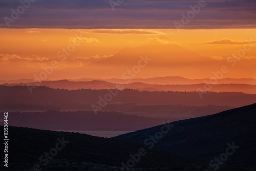 Sunset Hilly Landscape, volcano in the distant background