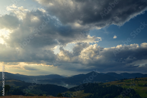 Sunset in carpathian mountains - beautiful summer landscape, spruces on hills, dark cloudy sky and bright sun light, meadow and wildflowers