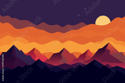 mountain, landscape, nature, sky, mountain, sunset, vector, hill, fog, peak, view, silhouette, illustration, range, mist, sunrise, morning, vale, forest, rock, blue, sun, horizon, cloud, outdoors
