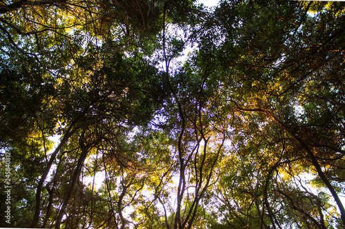 tree, forest, nature, tree, sky, autumn, leaf, green, fall, wood, foliage, summer, leaf, tree branch, park, branch, landscape, blue, yellow, pine, season, colours, sun, up, natural, wood, light, fog, sunlight, road, sunrise, path, morning, mist