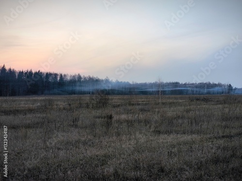 Sunset in the misty forest, fog morning over the meadow. Sunrise in a bog, wetland. Calmness, relaxation, meditation, beauty of nature concept. Misty mystical evening in the field.