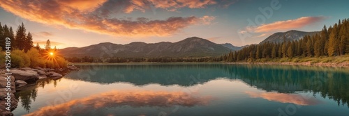 Sunset Lake Panorama Mountain Reflection Colorful Clouds Scenic View