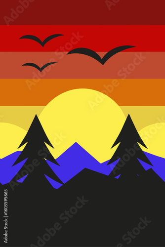 sunset, landscape, tree, bird, sky, nature, evening, silhouette, mountain, warm colors, vibrant, serene, twilight, graphic, illustration, simple, stylised, horizon, dusk, peaceful, scenic, travel, adventure, wilderness, evening sky, pine tree, mountain chain, colorful sky, natural beauty, scenic view, graphic design