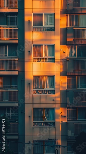 Sunset light casts a warm glow on the facade of an urban apartment building, highlighting the windows and creating long shadows.