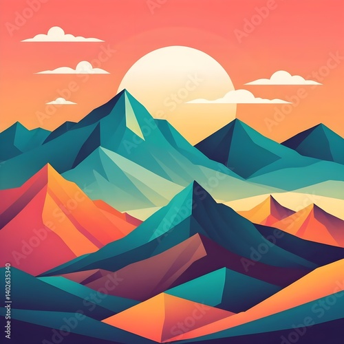mountain, mountain, range, sunset, sunrise, sun, sky, cloud, geometric, polygonal, landscape, nature, scenery, vibrant, colourful, teal, orange, red, pink, summer, warm, peaceful, serene, tranquil, majestic, beauty, digital artwork