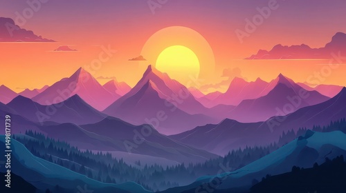 sunset, landscape, digital, art, illustration, range, nature, scenic, view, panorama, hill, forest, tree, sky, cloud, sun, artwork, graphic, design, image, background, wallpaper, desktop, screen, vibrant, colours, peaceful, serene, tranquil