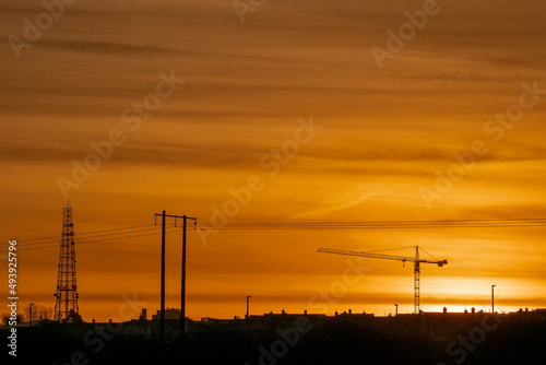 sunset, scene, nature, town, city, urban, crane, construction, tall, warm, orange, colours, silhouette, nobody, calm, peaceful, sunrise, tone, cloudscape, scenery, place, area, environment, mood, background, landscape, relaxing, cosy, glowing, comfortable, soft, serene, quiet, tranquil, relaxed, spirit, feeling, atmosphere, emotion, air