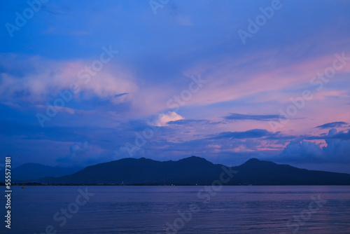 sunset on Dermaga Cinta Beach, Banyuwangi. Sunset with view of Bali Island. Sunset over the sea.