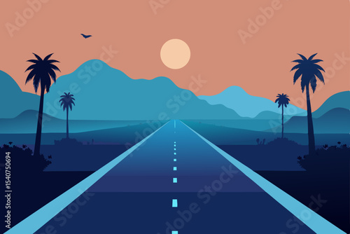sunset, road, sky, palm, beach, tree, highway, travel, sun, landscape, tropical, nature, sunrise, summer, sea, silhouette, vector, island, car, asphalt, ocean, horizon, illustration, palm tree, desert