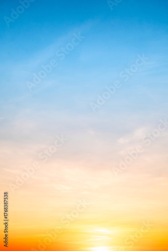Sunset or sunrise sky with a vibrant gradient of orange, gold, and soft blue. Clear atmosphere with wispy clouds. Peaceful, natural light background. hope, freedom, new day Concepts, Vertical