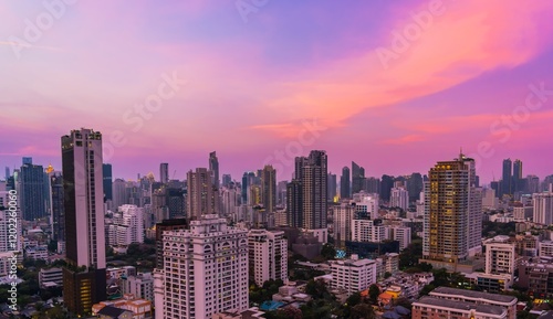 Sunset over a bustling city skyline with colorful clouds and modern architecture