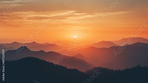 sunset over a majestic mountain range, with the peaks silhouetted against the fiery sky.