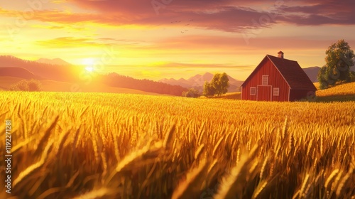 Sunset over a quiet countryside barn surrounded by golden wheat fields, evoking nostalgia and rural simplicity