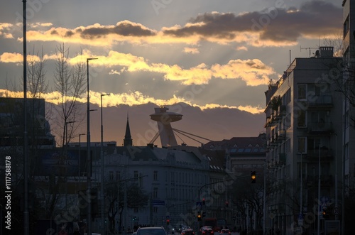 Sunset over Bratislava cityscape featuring the iconic UFO observation tower on SNP Bridge, with dramatic clouds and sun rays piercing through.