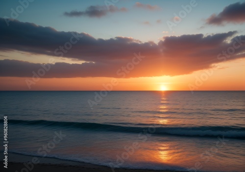 sunset, ocean, beach, calm, wave, serene, peaceful, horizon, sea, evening, dusk, cloud, nature, landscape, shoreline, calmness, coastal, scenic, view, natural, beauty, relaxing, water, summer, vacation, twilight, orange sky, sunlight, sand, oceanfront, cloudscape, golden hour, sun, sunset beach, nature scene, travel