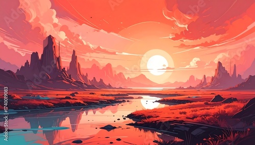 sunset, landscape, desert, mountain, river, sky, cloud, illustration, nature, scenic, orange, art, beautiful, view, travel, environment, outdoors, sunlight, dawn, dusk, water, wilderness, terrain, horizon, panorama, vibrant, warm, colours, peaceful, artistic, vale, distant, tranquil, atmospheric, glow, abstract, digital, creative, natural, bright, background