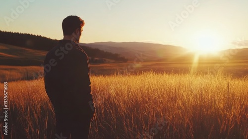 Sunset over golden fields with a silhouette of a man enjoying the peaceful view in a serene landscape