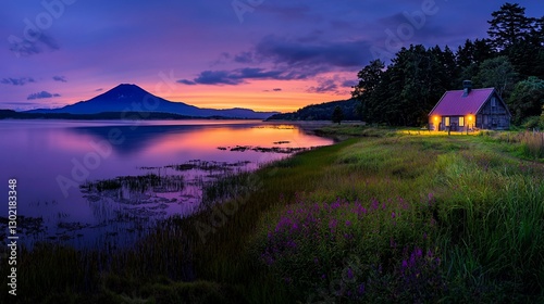 sunset, lake, mountain, cabin, house, landscape, nature, water, sky, cloud, tree, dusk, twilight, scenic, view, beautiful, serene, peaceful, calm, calmness, quiet, solitude, relaxation, evening, night, colours, vibrant, majestic, idylli, summer, autumn, rural, remote, wilderness, light, illumination, home, bungalow, flower, plant, grass, shore, bank