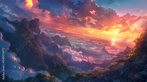 sunset, mountain, sky, cloud, horizon, orange, pink, purple, blue, gold, light, ray, landscape, nature, view, scenery, dramatic, art, fantasy, digital, painting, illustration, majestic, huge, wispy, aethereal, magic, serene, tranquil, peaceful, beauty, wonder, awe, inspiration, dreamy, enchanting, breathtaking, vista, range