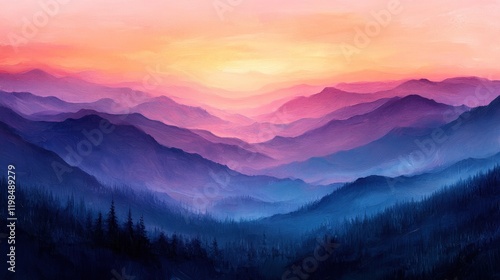 mountain, sunset, landscape, pink, purple, blue, hazy, serene, calm, peaceful, majestic, huge, expansive, dreamy, aethereal, colourful, vibrant, tranquil, picturesque, scenic, beautiful, art, painting, digital, artwork, nature, scenery, horizon, silhouette, forest