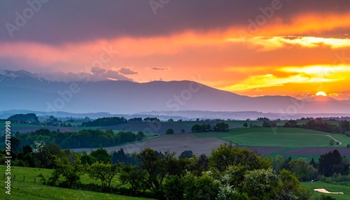 sunset, sunrise, landscape, mountain, hill, rural, countryside, nature, scenery, panoramic, view, spring, summer, evening, golden hour, cloud, sky, vibrant, colourful, picturesque, beautiful, serene, tranquil, peaceful, travel, photo, background, image, wallpaper, farm, field, agriculture, green, tree, alps, mountain chain, digital, diversity, modern