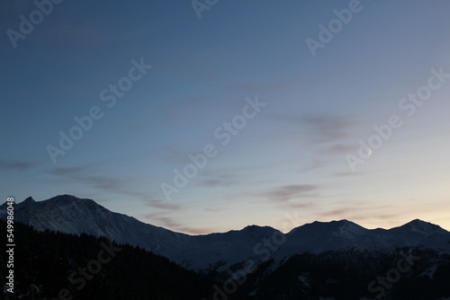 Sunset over Swiss alpine mountains. Silhouette of a mountain range against sky at sunset with gradient from indigo to light pale yellow. Snow on peaks