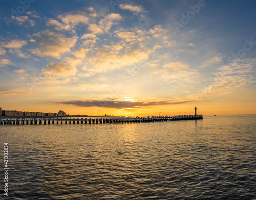 Sunset over the old wooden pier of Nieuwpoort, Belgium.