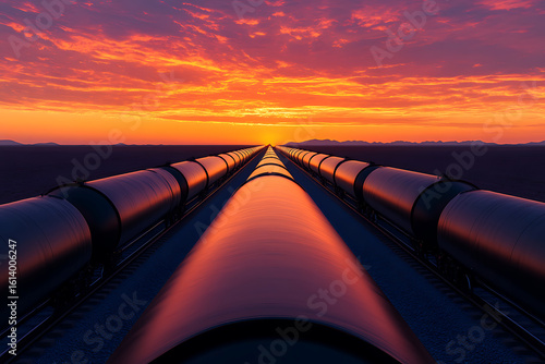 Sunset Over the Rails: An endless train extends into the horizon, illuminated by a vibrant sunset, showcasing transportation against a colorful sky.