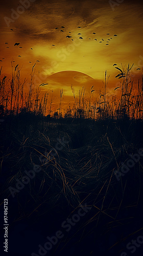 sunset, reed, meadow, nature, composition, landscape, dawn, background, sunrise, sun, dusk, field, evening, countryside, sky, grass, scene, rural, yellow, country, orange, cloud, illustration, scenery, painting, vertical, silhouette, natural, scenic, poster, art, floral, plant, flora, foliage, decorative, artwork, flat