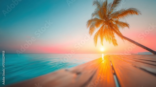 sunset, ocean, palm, tree, wooden, pier, tranquil, horizon, colourful, sky, serene, beach, evening, nature, water, tropical, landscape, silhouette, relaxation, warm, peaceful, coastline, vacation, scenic, beauty, travel, escape, leisure, environment, dusk, destination, stillness, paradise, tour tourism, natural, line, gentle, wave, colours, dreamlike, hue, view, panoramic