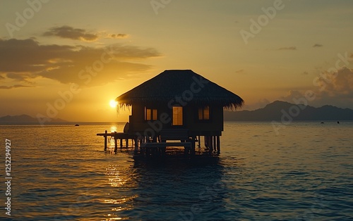 sunset, water, hut, tropical, beach, ocean, house, vacation, island, paradise, resort, travel, get-away, nature, sunrise, sea, calm, relax, beautiful, scenic, tour tourism, summer, holiday, destination, relaxing, serenity, tranquil, peaceful, luxury, romantic, view