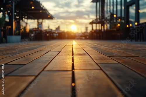 Sunset over wooden deck at outdoor venue with warm lighting and urban skyline in the background